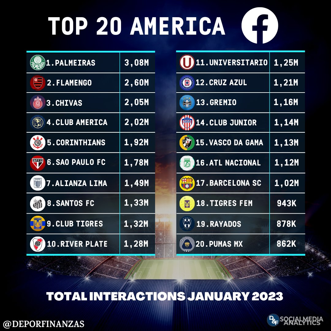 📲⚽¡Los 20 clubes de América con más interacciones en facebook durante enero 2023!💙👍😀😡😢😮😍⤴💬
