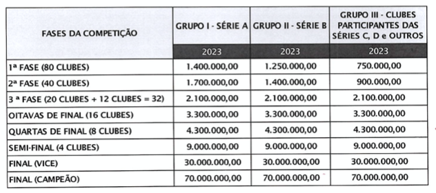 As cotas das demais fases também receberam acréscimo de até 20%. No ofício enviado pela CBF, nesta quarta-feira (01), às federações e aos clubes consta a tabela de cotas de premiação com os valores que as agremiações poderão receber em cada fase da disputa. As quantias a serem pagas para cada clube dependem diretamente do desempenho deles. As cotas serão distribuídas por cada avanço de fase, respeitando o grupo ao qual cada clube pertence.