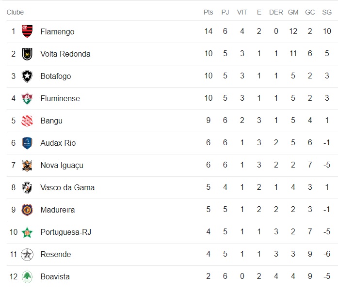 Veja a classificação da Taça Guanabara após os jogos de 4ª-feira; Vasco está em 8º lugar