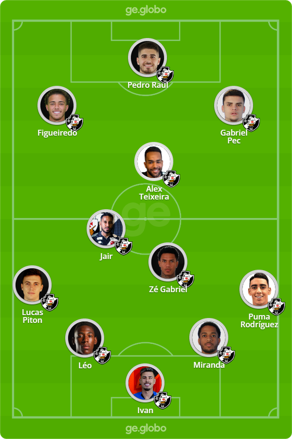 Provável escalação do Vasco: Ivan, Pumita, Miranda, Léo, Piton Zé Gabriel, Jair, Alex Teixeira, Figueiredo, Gabriel Pec e Pedro Raul.