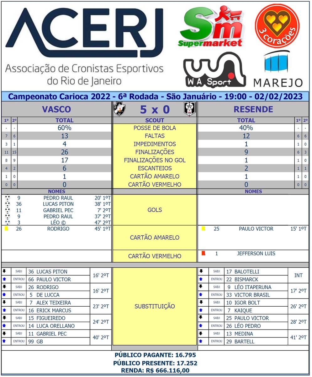 02/02/23 - Confira as estatísticas de Vasco 5 x 0 Resende