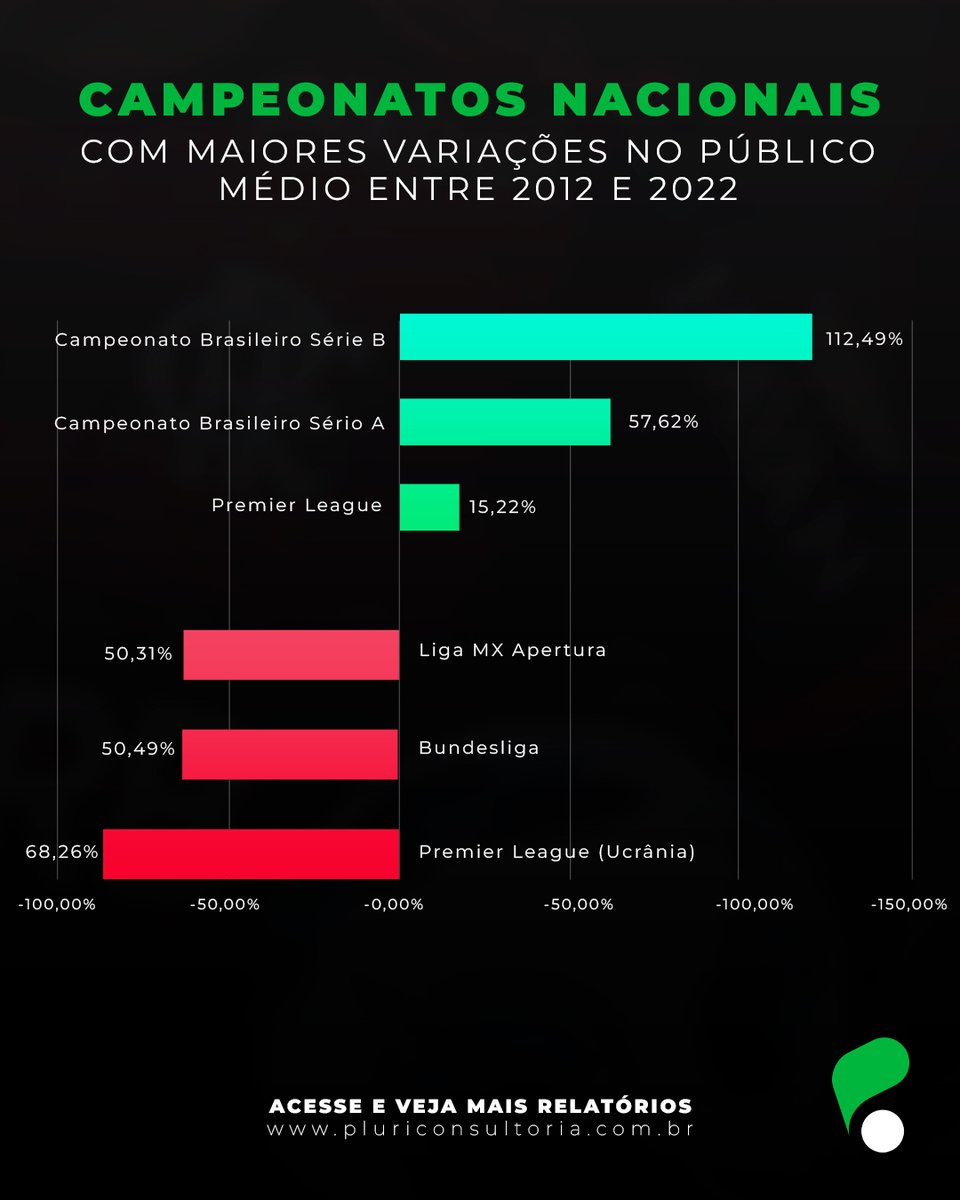 A Série B do Brasileirão, que teve a presença de clubes como Cruzeiro, Grêmio, Vasco e Bahia em 2022 teve um aumento de 112,5% em relação a média de 2012; a Série A apresentou um crescimento de 57,6%.