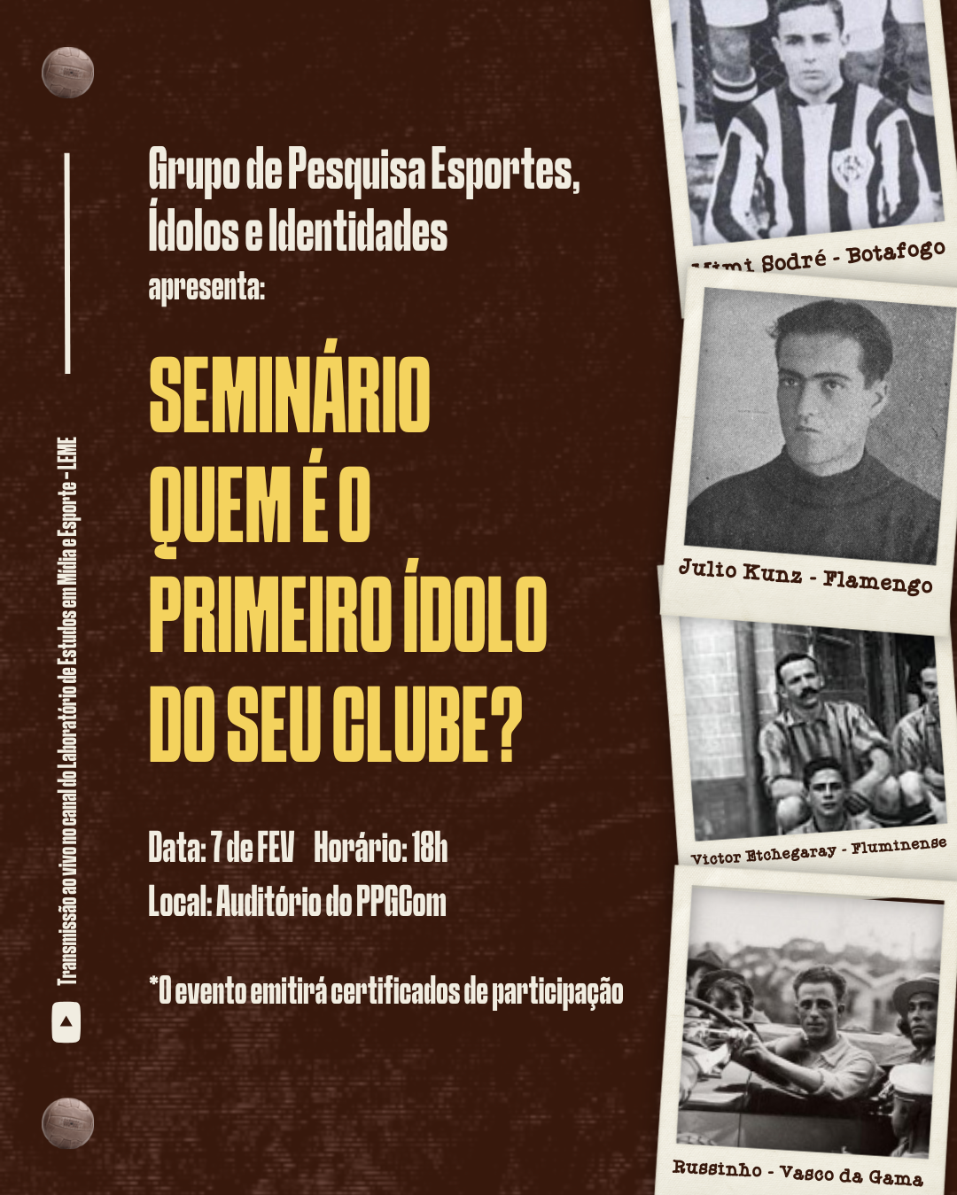 O Seminário "Quem é o primeiro ídolo do seu clube?", acontece no dia 7 de fevereiro, às 18h, no auditório do PPGCom da UERJ, no 10º andar, às 18h, com transmissão ao vivo do canal do Laboratório de Estudos em Mídia e Esporte (Canal lemeuerj)[1] no Youtube. A iniciativa é do Grupo de Pesquisa Esportes, Ídolos e Identidades (GEII), coordenado pelo professor do Departamento de Jornalismo da FCS da UERJ e doutor em Comunicação pela UFF, Sérgio Montero Souto, também pesquisador do LEME, e integrado pelos alunos e ex-alunos da graduação da FCS Enzo Tomaz Anselmo, Gustavo Silva Fernandes, Maíra Vallejo dos Santos e Maria Vitória Santos Pereira.