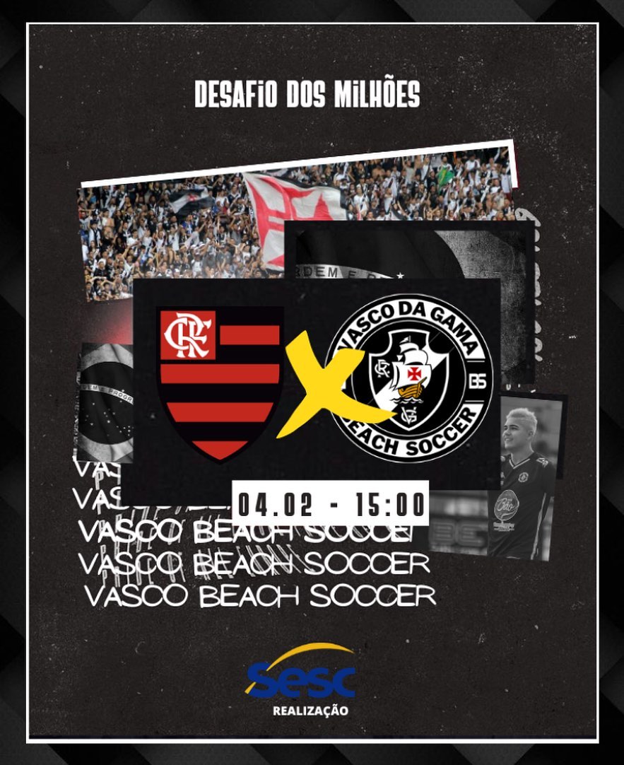 Vascaínos, no próximo dia 04.02 (sábado) as 15:00 nós teremos pela frente o segundo compromisso do ano, um amistoso contra o Flamengo, na Praia de São Francisco Xavier, Niterói, no evento de Verão, realizado pelo @sescniteroi 😁