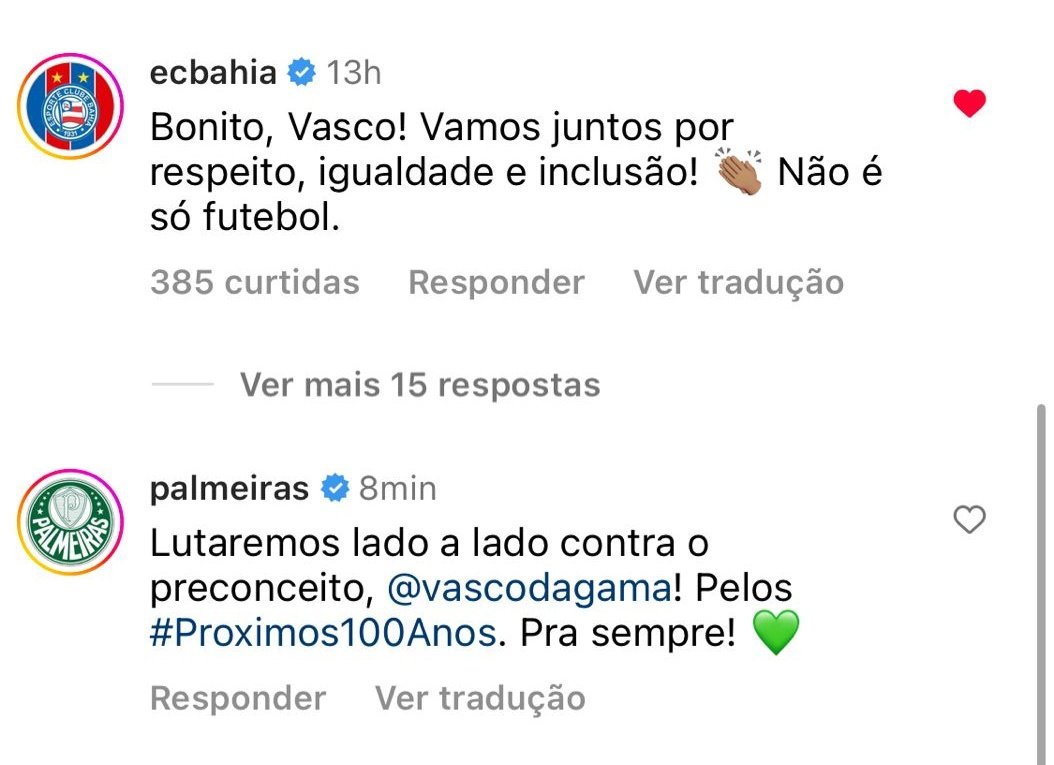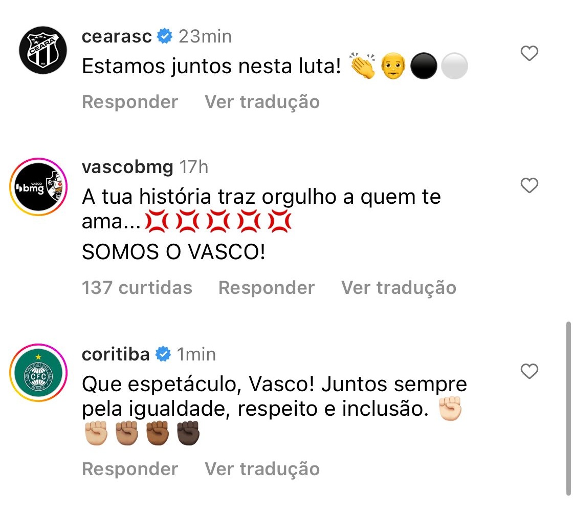 No Brasil, Remo, América-MG, CSA, Santo André, Coritiba, Cruzeiro, Bahia, Palmeiras, Ceará, Coritiba, Bahia, Brusque, Tuna Luso, Vitória e Confianca (SE) interagiram com o Vasco e a postagem em suas redes sociais. Os clubes portugueses Porto, Vitória de Setúbal e Paços Ferreira também comentaram.