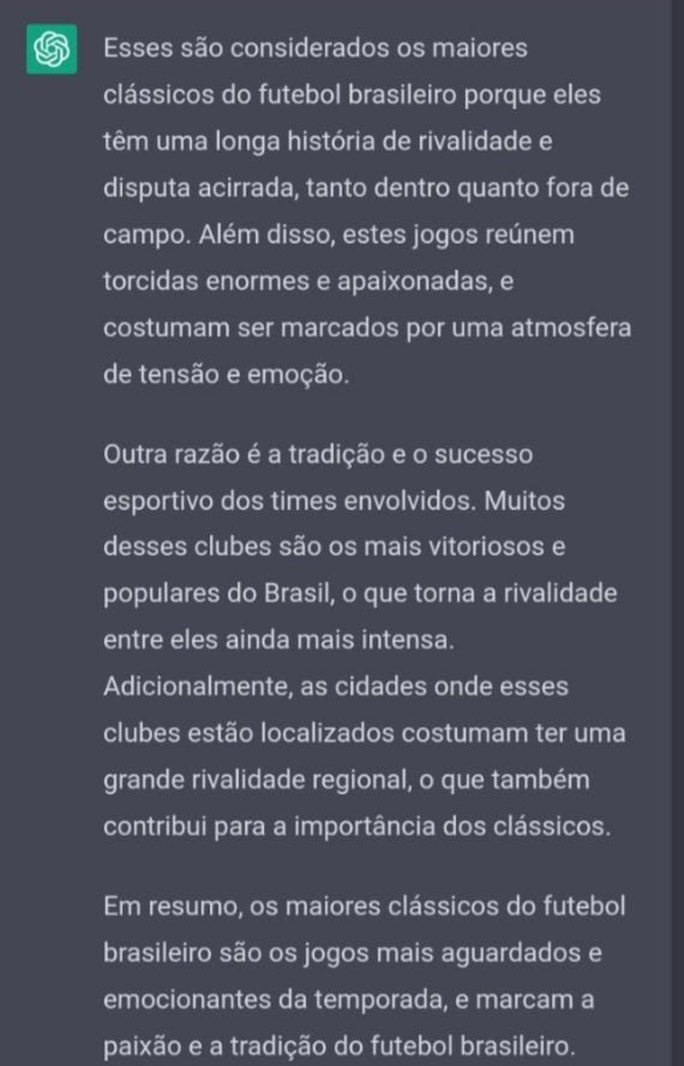 O ChatGPT não apenas escolhe os maiores clássicos assim como explica o motivo da escolha por esses confrontos.