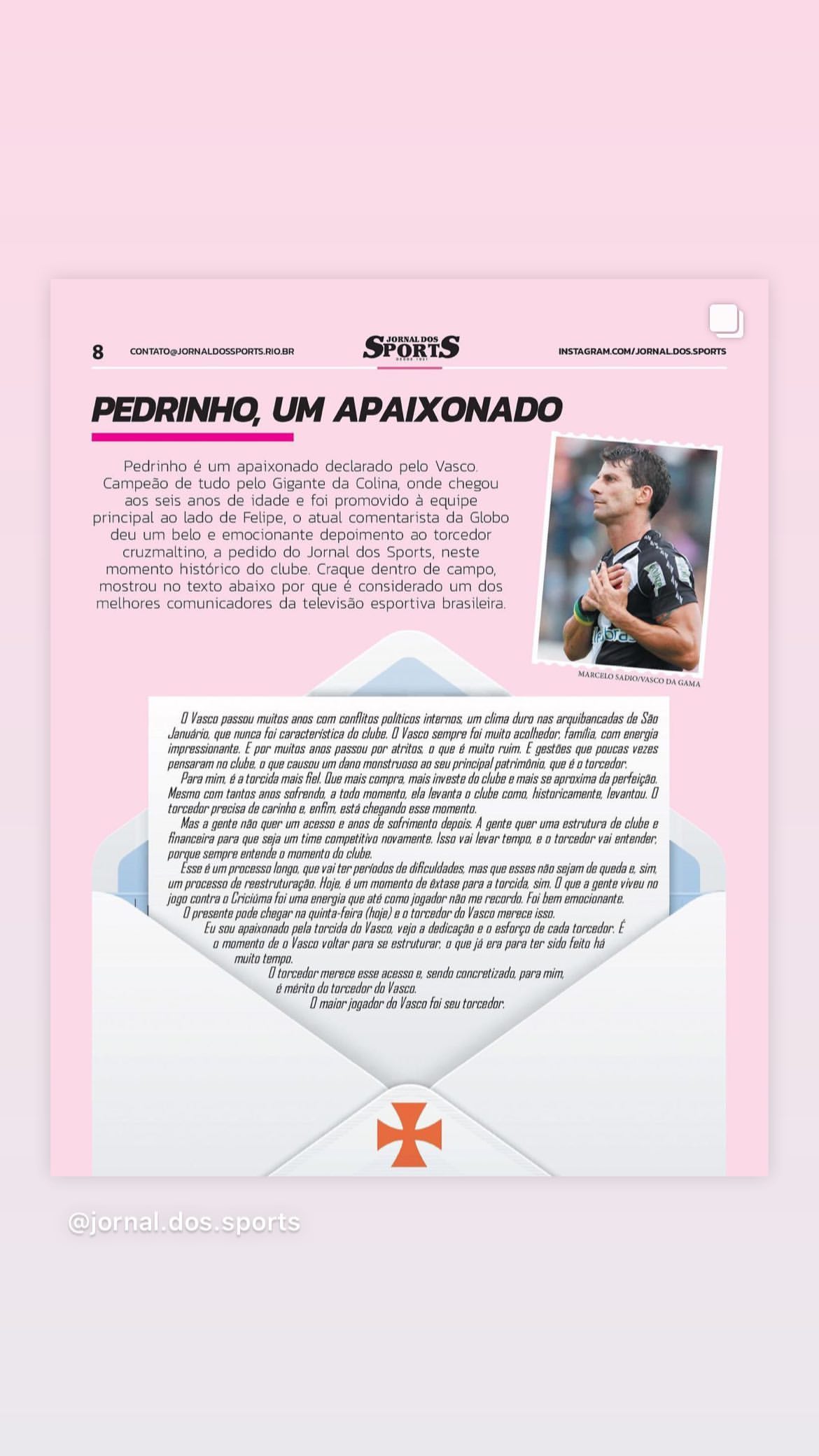 22/10/22 - Pedrinho comentará Vasco x Criciúma; confira profissionais que trabalharão no jogo