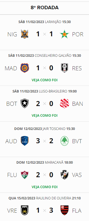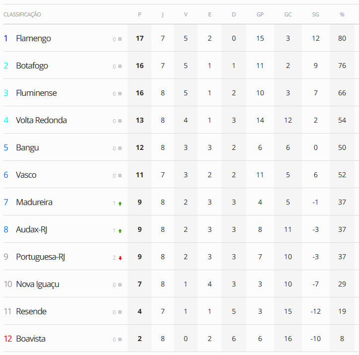 O jogo Volta Redonda 1 x 3 Flamengo encerrou a 8ª rodada da Taça Guanabara. Com a derrota do Volta Redonda, se o Vasco derrotar o Botafogo nesta 5ª-feira, em jogo reprogramado da 3ª rodada, entrará no G4.
