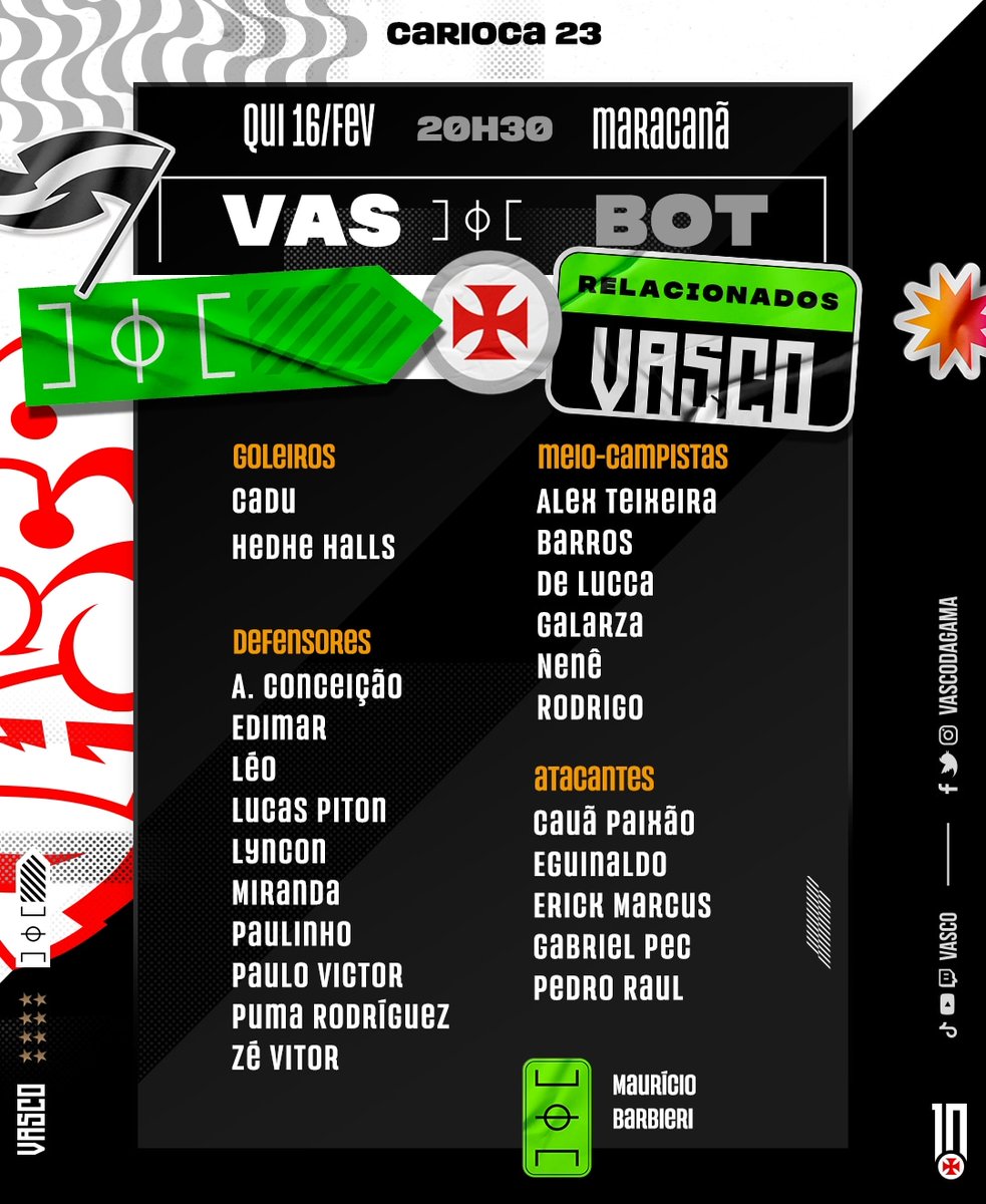 Confira os relacionados do Vasco para o jogo contra o Botafogo
