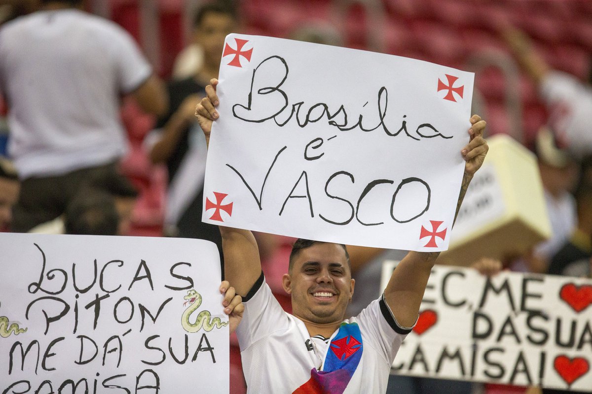 Foto mostra cartazes de torcedores vascaínos no Mané Garrincha; veja