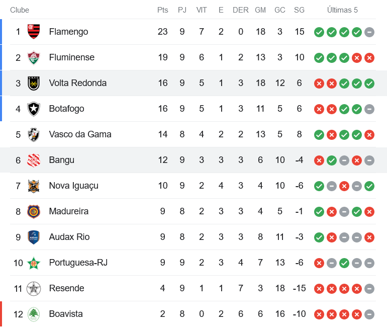 O Volta Redonda goleou o Bangu por 4 a 0 na tarde deste domingo. Com o resultado, o Vasco caiu para a 5ª colocação da Taça Guanabara, mas poderá voltar ao G4 ainda na rodada caso vença o Boavista nesta segunda-feira às 19h30 em São Januário.