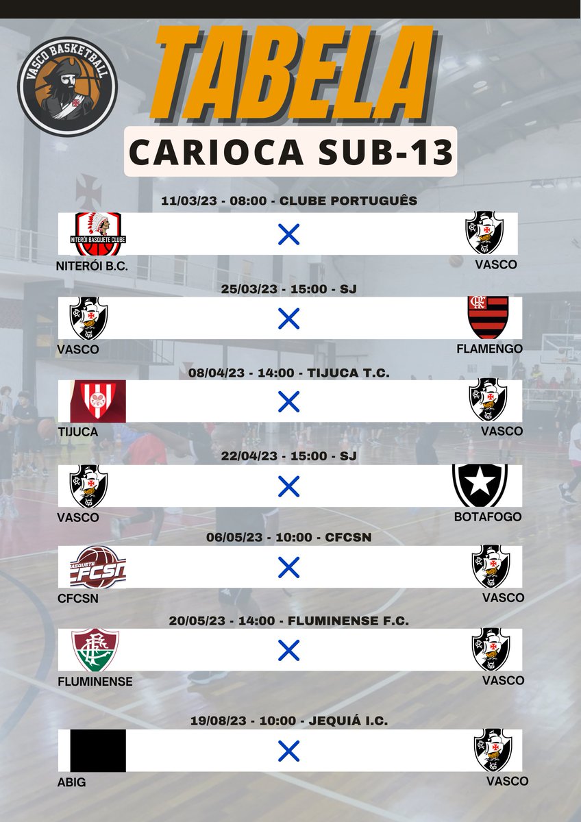🏀O Carioca Sub-13 terá início no dia 11/03. Segue a tabela de jogos do Vasco.