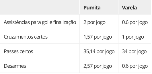 Até agora, quem tem ido melhor no Estadual é o lateral vascaíno. Na média por jogo, Pumita tem números superiores em assistências para gol e finalizações, cruzamentos certos, passes certos e desarmes. O clássico será oportunidade para o vascaíno se testar contra o arquirrival, ferido após o vice na Recopa. E quem sabe tomar a titularidade de Varela na seleção.