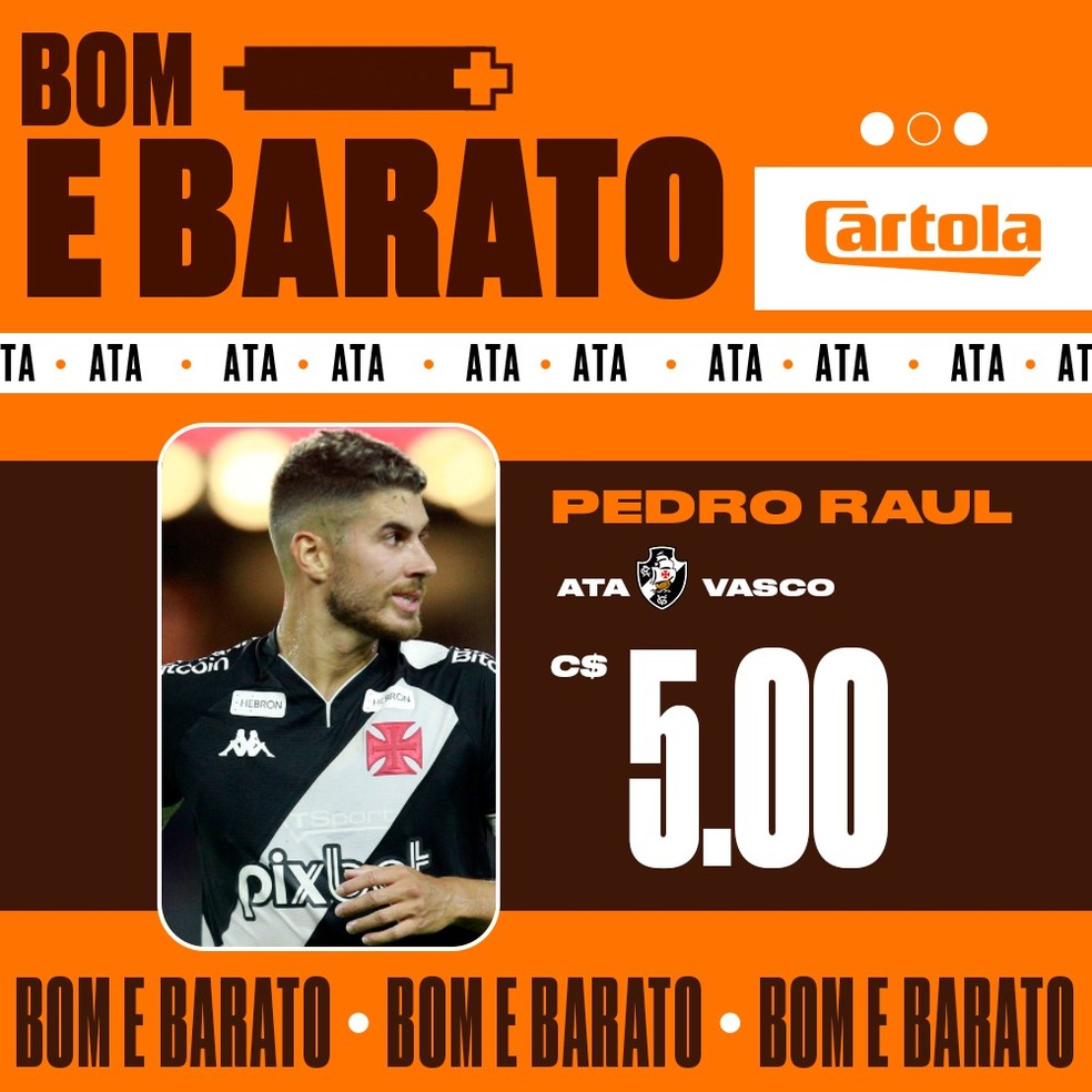 Com folga, Pedro Raul, do Vasco da Gama, foi eleito o atacante Bom e Barato do Cartola 2023. Vice-artilheiro do Brasileirão do ano passado, quando atuava pelo Goiás, o agora centroavante cruzmaltino recebeu 55% dos mais de 20 mil votos da enquete e irá começar o Brasileirão custando apenas 5 cartoletas. A disputa pela segunda posição foi acirrada: Gilberto, do Cruzeiro, recebeu 23% dos votos, enquanto Tiquinho Soares, do Botafogo, veio logo atrás, com 22%. Os dois também tiveram seus preços definidos: