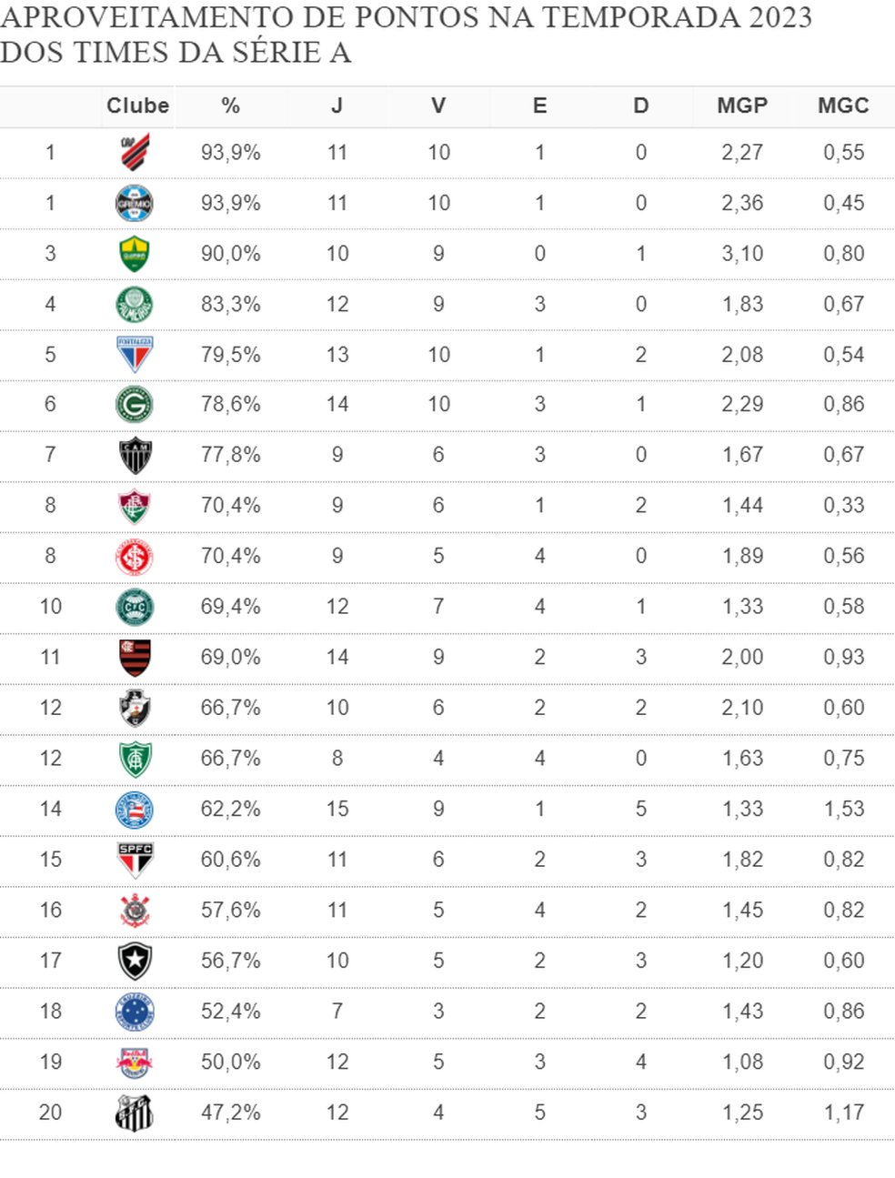 Os piores desempenhos da temporada até aqui são os de Botafogo, Cruzeiro, Bragantino e Santos, que têm entre 56,7% e 47,2% de aproveitamento, como mostra o quadro abaixo.