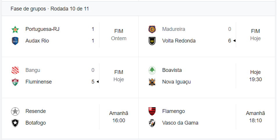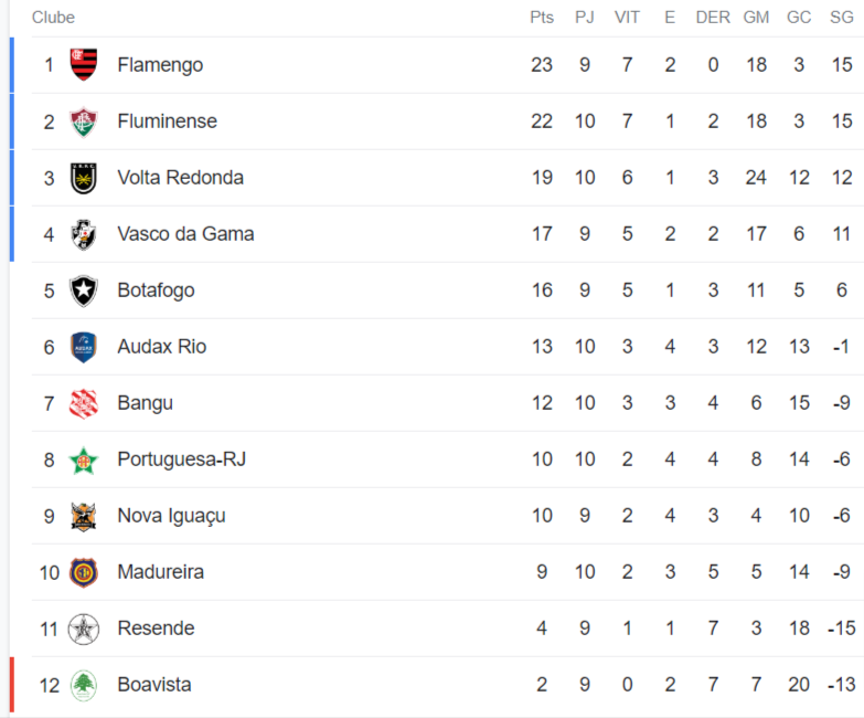 O Volta Redonda goleou o Madureira por 6 a 0 na tarde deste sábado. Com o resultado, o Vasco caiu para a 4ª colocação da Taça Guanabara. Com a vitória do Fluminense, que enfrenta o Flamengo na última rodada, o Vasco não tem mais chances matemáticas de levantar a Taça Guanabara.