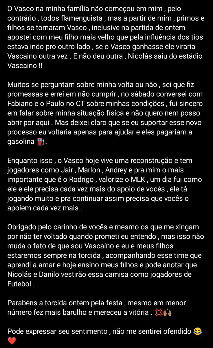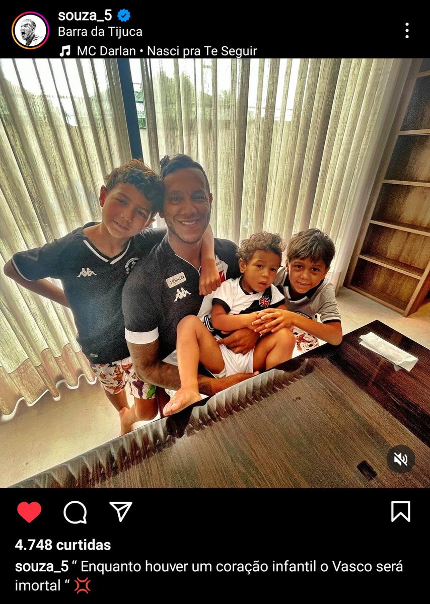 Em postagem no Instagram, Souza abre o jogo sobre possível retorno ao Vasco