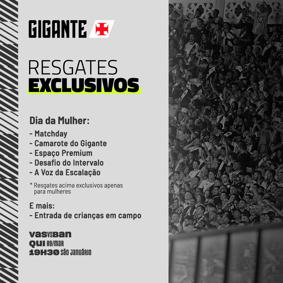 Sócio Gigante terá resgates exclusivos para mulheres para Vasco x Bangu a partir das 12h desta 4ª-feira