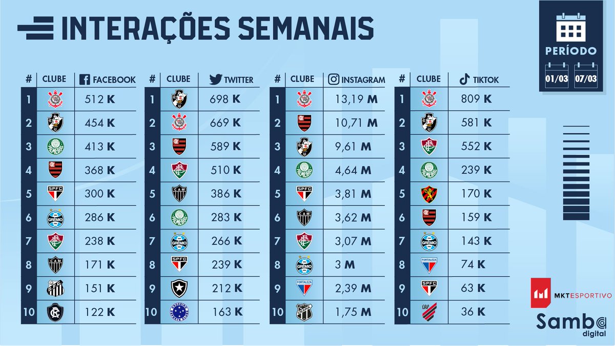 Vasco ficou em 1º lugar em interações semanais no Twitter e em 2º no Facebook e no TikTok entre os clubes brasileiros