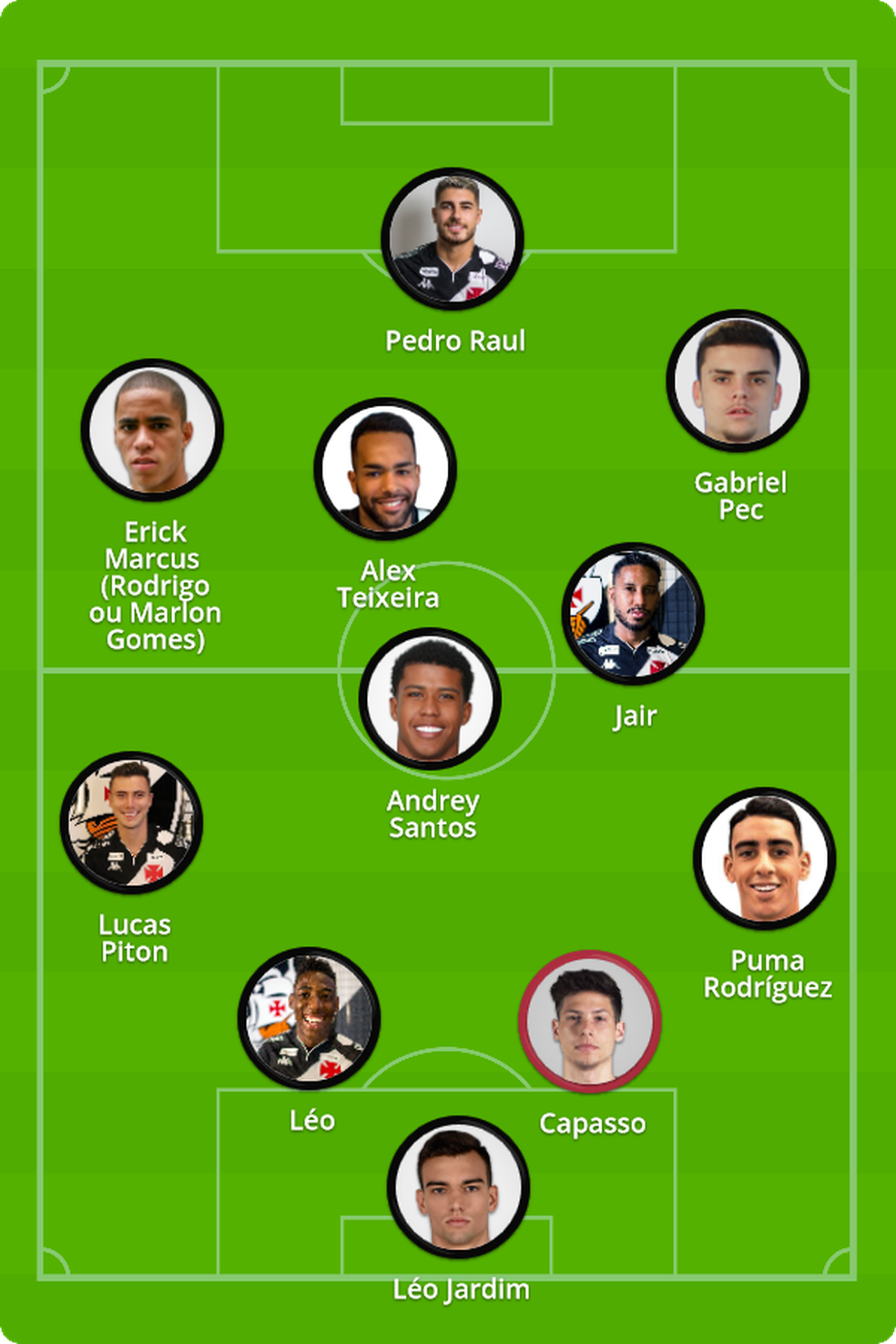 Provável escalação do Vasco: Léo Jardim, Pumita, Capasso, Léo, Lucas Piton; Andrey, Jair, Alex Teixeira, Erick Marcus (Rodrigo ou Marlon Gomes), Gabriel Pec e Pedro Raul.
