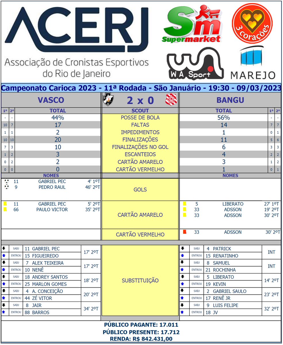Cartões amarelos: Gabriel Pec e Paulo Victor (Vasco); Guilherme Liberato (Bangu)