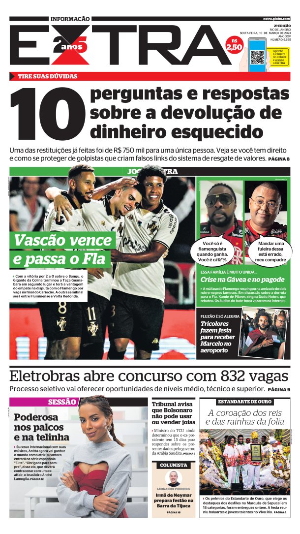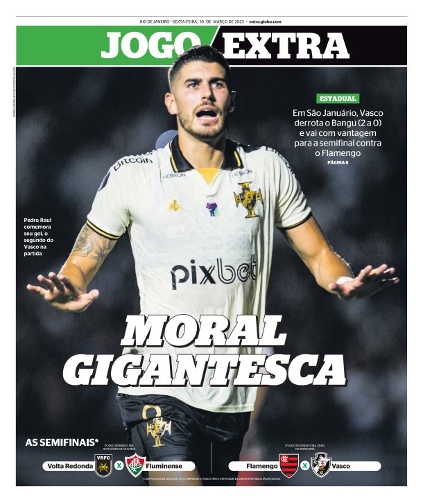 Pela última rodada da Taça Guanabara, o Vasco derrotou o Bangu por 2 a 0 em São Januário com gols de Gabriel Pec e Pedro Raul e enfrentará o Flamengo na semifinal do Estadual. Veja as capas dos jornais.