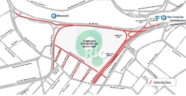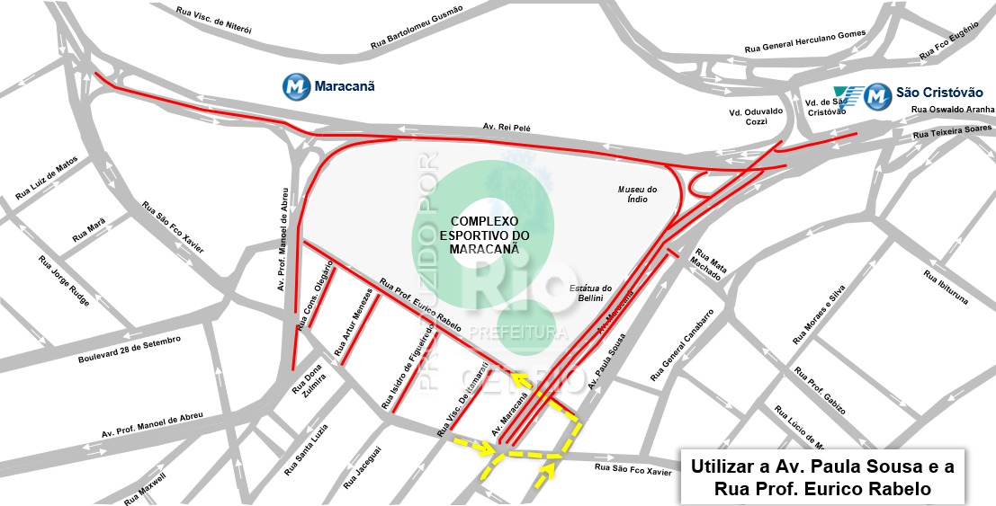 O acesso de veículos de moradores do entorno imediato ao Maracanã (ruas Prof. Eurico Rabelo, Visconde de Itamarati, Isidro de Figueiredo, Artur Menezes e Conselheiro Olegário) será feito, exclusivamente, pela Av. Paula Sousa e pela Rua Prof. Eurico Rabelo, mediante apresentação de comprovante de residência.