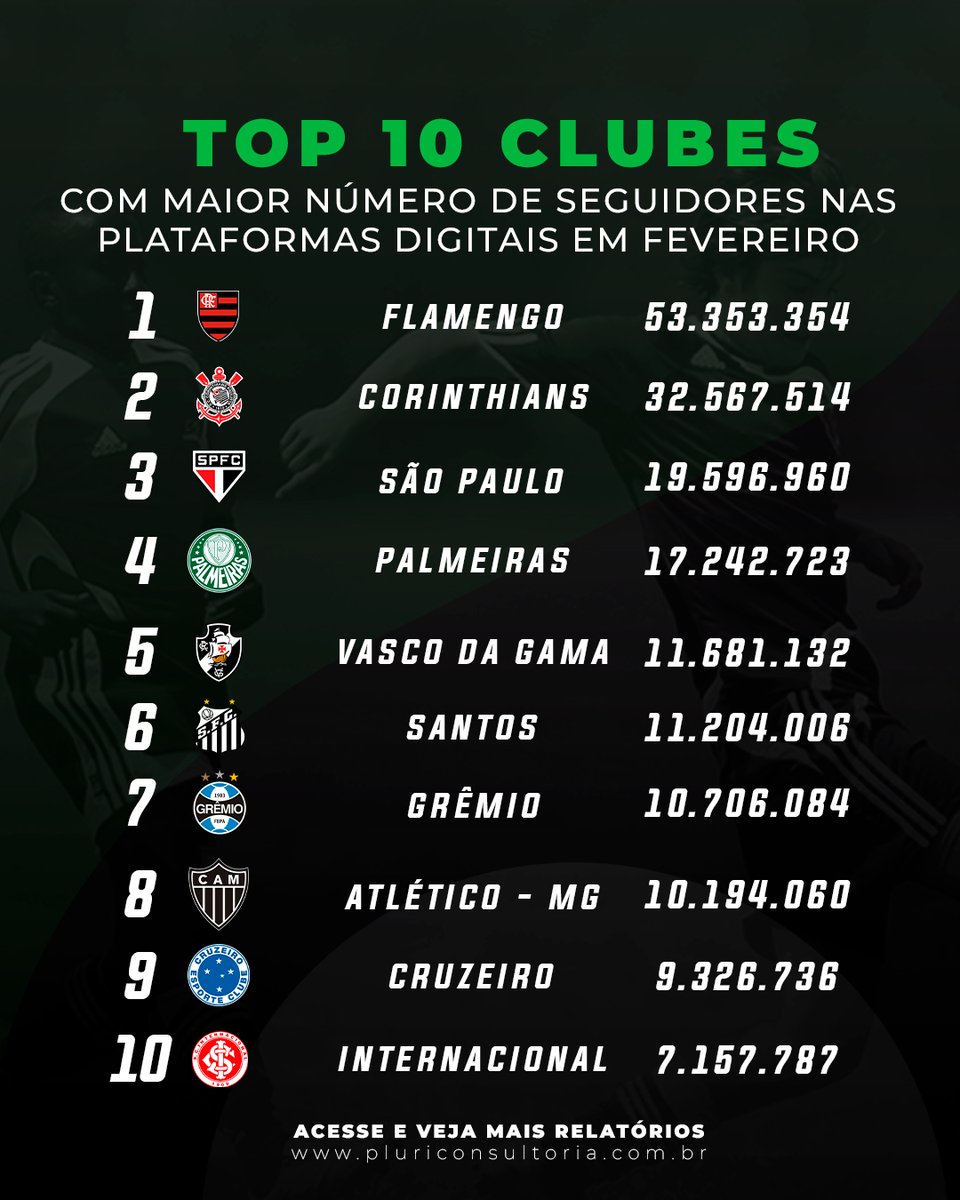 O Top 5 de clubes com maior número de seguidores se mantém inalterado com Flamengo na frente, Corinthians em 2º, São Paulo em 3º, Palmeiras em 4º e o Vasco fechando o Top 5.