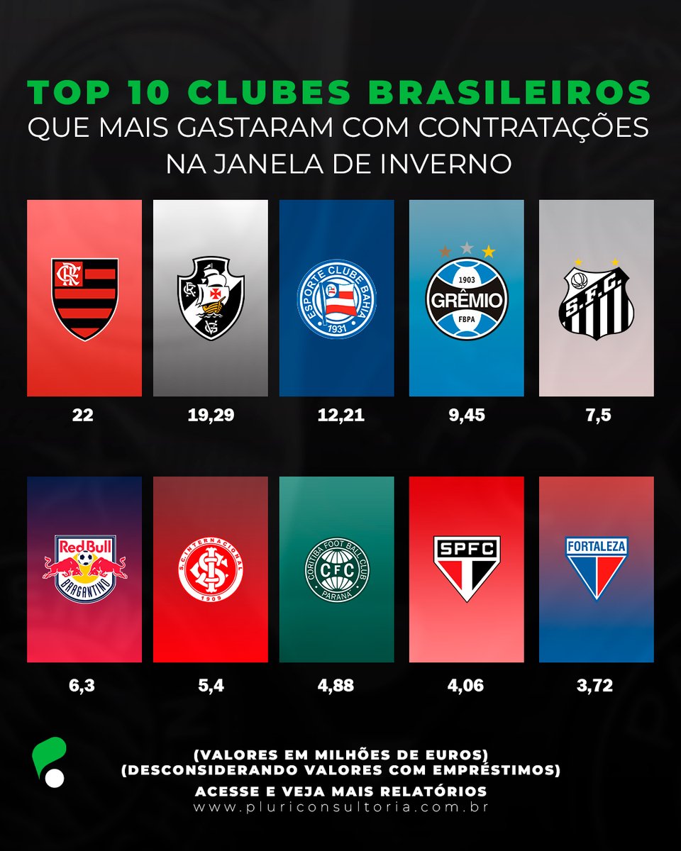 Flamengo e Vasco estão entre os 20 clubes do mundo que mais gastaram em contratações na janela de inverno – os únicos brasileiros no Top 20. O dado é do relatório da Pluri Consultoria. O rubro-negro carioca, com um total de 22 milhões de euros em contratações, sobretudo pela chegada de Gerson, é o 16º clube com maiores gastos na janela e o brasileiro que mais gastou no período.