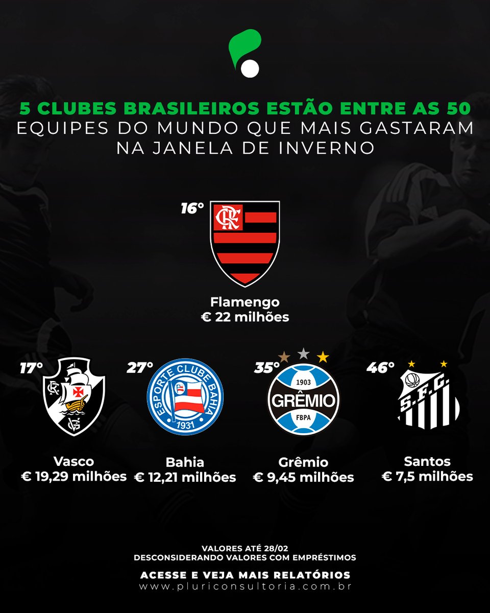 Flamengo, Vasco, Bahia, Grêmio e Santos estão entre as 50 equipes do mundo que mais gastaram com compras de jogadores na janela de inverno.