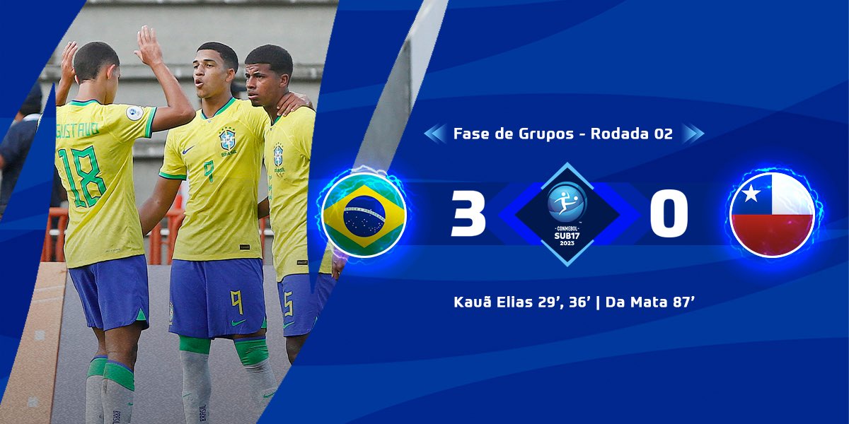A Seleção Brasileira venceu o Chile por 3 a 0 neste sábado (1), no estádio Christian Benítez, em Guayaquil, e chegou à sua primeira vitória no Sul-Americano Sub-17. Com dois gols de Kauã Elias e um de Da Mata, o Brasil manteve o controle da partida durante os 90 minutos e construiu o resultado com tranquilidade. O destaque do jogo pertence mais uma vez ao atacante Kauã Elias, que chegou ao seu quarto gol em dois jogos.