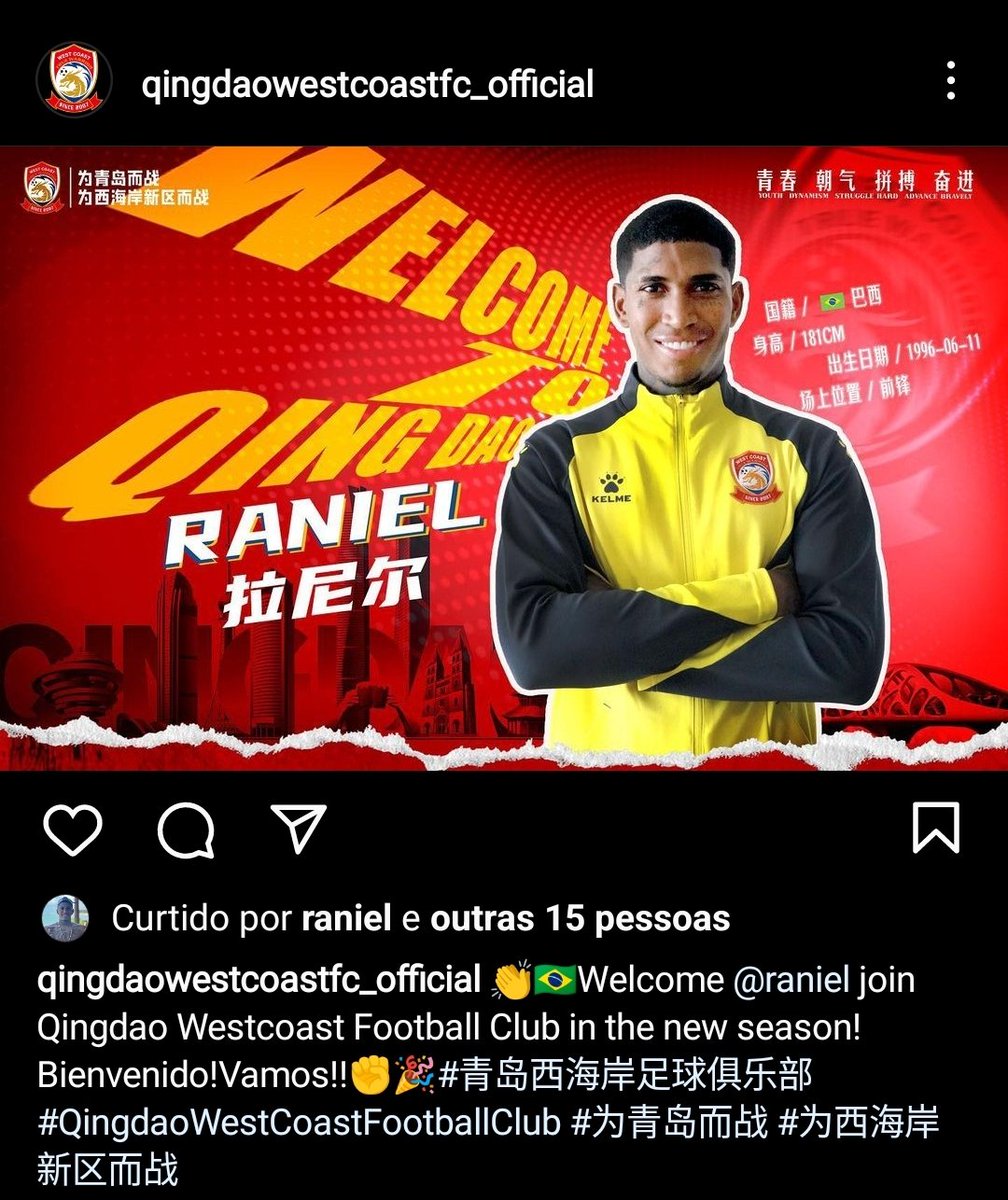 Raniel, o Ranissauro, acaba de ser anunciado pelo Qingdao Westcoast FC, clube que atua pela segunda divisão chinesa.