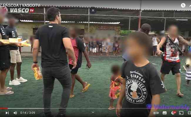 Nas imagens, os atletas vascaínos aparecem com caixas de chocolates nas mãos, assim como algumas das crianças, o que remete a uma ação social de Páscoa.