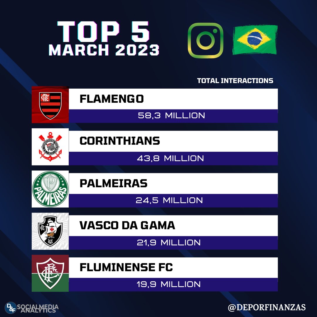 📲⚽🇧🇷 Os 5 clubes brasileiros com mais engajamento no #instagram durante março 2023!