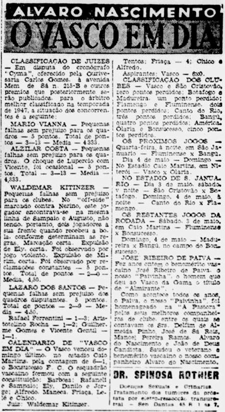 Naquele ano, Alvaro do Nascimento, em uma de suas colunas que escrita para o jornal carioca, denominada "O Vasco em dia", desenvolveu uma classificação própria da atuação dos árbitros para aquela temporada, pontuando os juízes de futebol de acordo com a qualidade da arbitragem nos jogos.