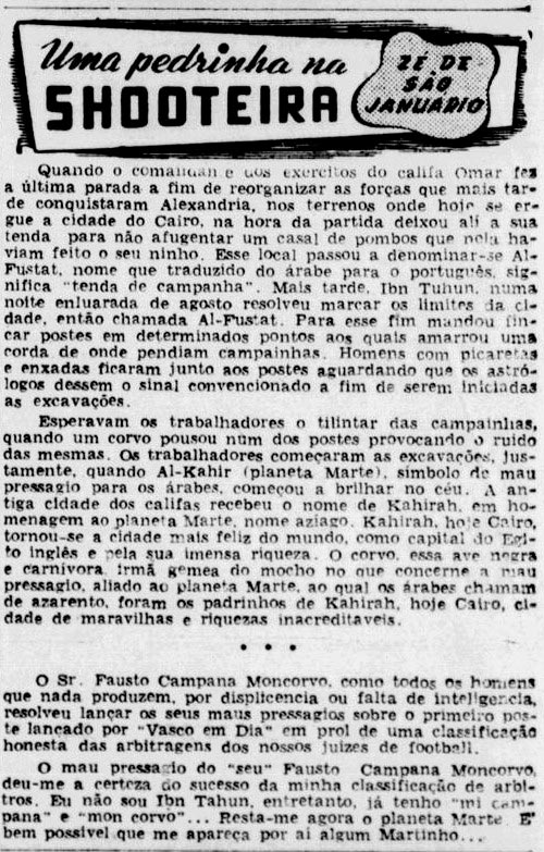 Buscando inspiração nas lendas em torno da fundação da antiga capital egípcia sob domínio mulçumano, Fostate, e daquela que a sucedeu em definitivo, a cidade do Cairo, Alvaro do Nascimento lançou mão de um jogo de palavras que ligava o sobrenome "Moncorvo" à tentativa de agourar a sua iniciativa de classificar os árbitros na coluna "Vasco em dia".