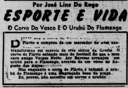 REGO, José Lins do. Esporte e vida. O Corvo do Vasco e o Urubú do Flamengo. Jornal dos Sports, Rio de Janeiro, 01 de novembro de 1947, p. 3. Acervo: Biblioteca Nacional. |