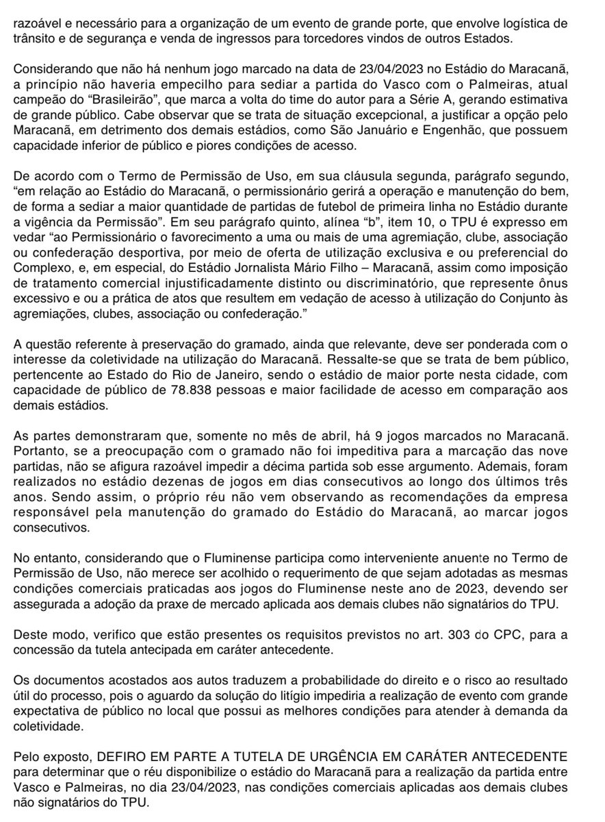 "Defiro em parte a tutela de urgência em caráter antecedente para determinar que o réu disponibilize o estádio do Maracanã para a realização da partida entre Vasco e Palmeiras, no dia 23/04/2023, nas condições comerciais aplicadas aos demais clubes não signatários do TPU'.