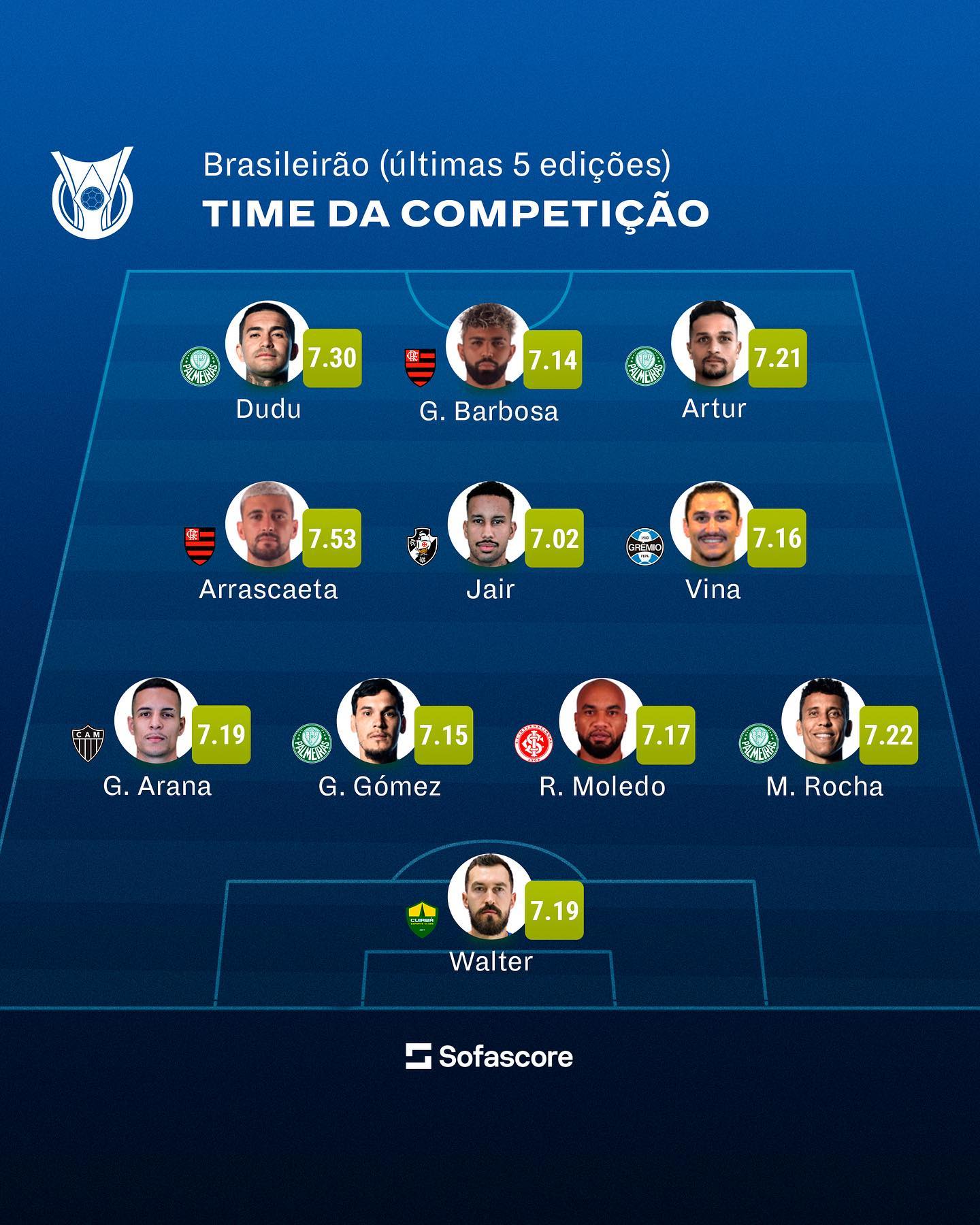 Montamos um time ideal das últimas cinco edições do Brasileirão (desde 2018) baseado nas Notas Sofascore! 🔥