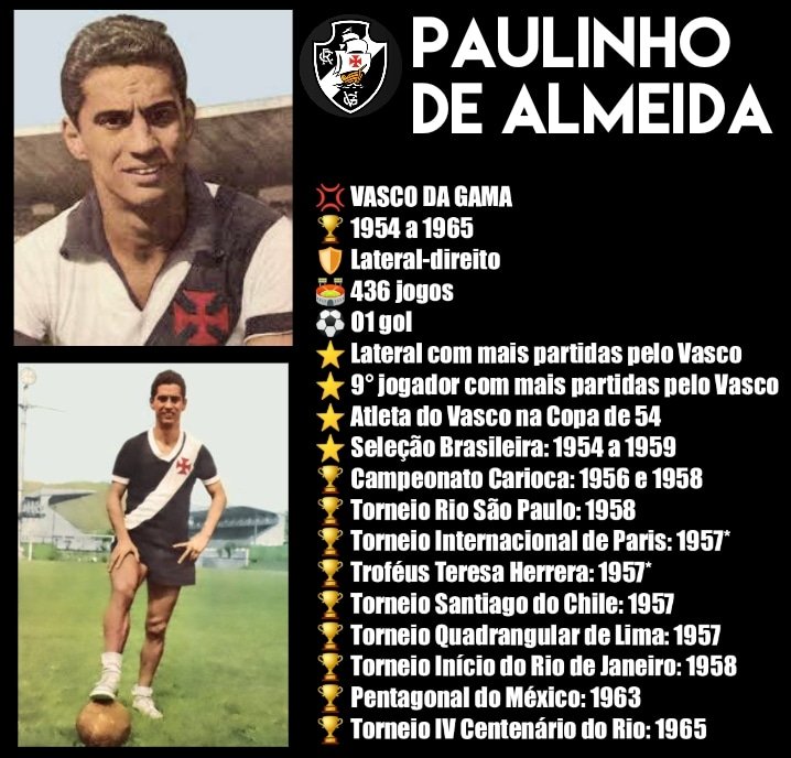 Exatos 91 anos do nascimento do ídolo Paulinho de Almeida, um dos maiores laterais direitos da história do Vasco da Gama! O saudoso gaúcho é o lateral com mais partidas pelo clube e envergou a cruz de malta por uma década! Trabalhou tbm na base e foi técnico vascaíno em 68 e 69!