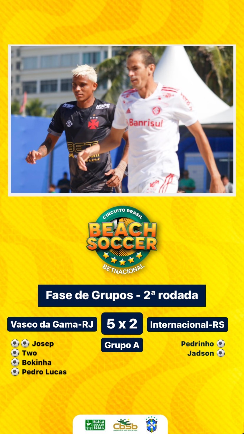 Pela 2ª rodada do Circuito Brasil de Beach Soccer, o Vasco derrotou o Internacional por 5 a 2 na manhã deste sábado na Praia de Copacabana, no Rio de Janeiro.
