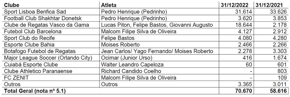O Corinthians fechou 2022 com R$ 70,6 milhões a receber de outros clubes por conta de transferências de jogadores - o que engloba direitos econômicos e também mecanismo de solidariedade da Fifa.