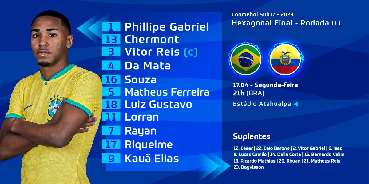 Phillipe Gabriel, Matheus e Rayan serão titulares contra o Equador pelo Sul-Americano Sub-17