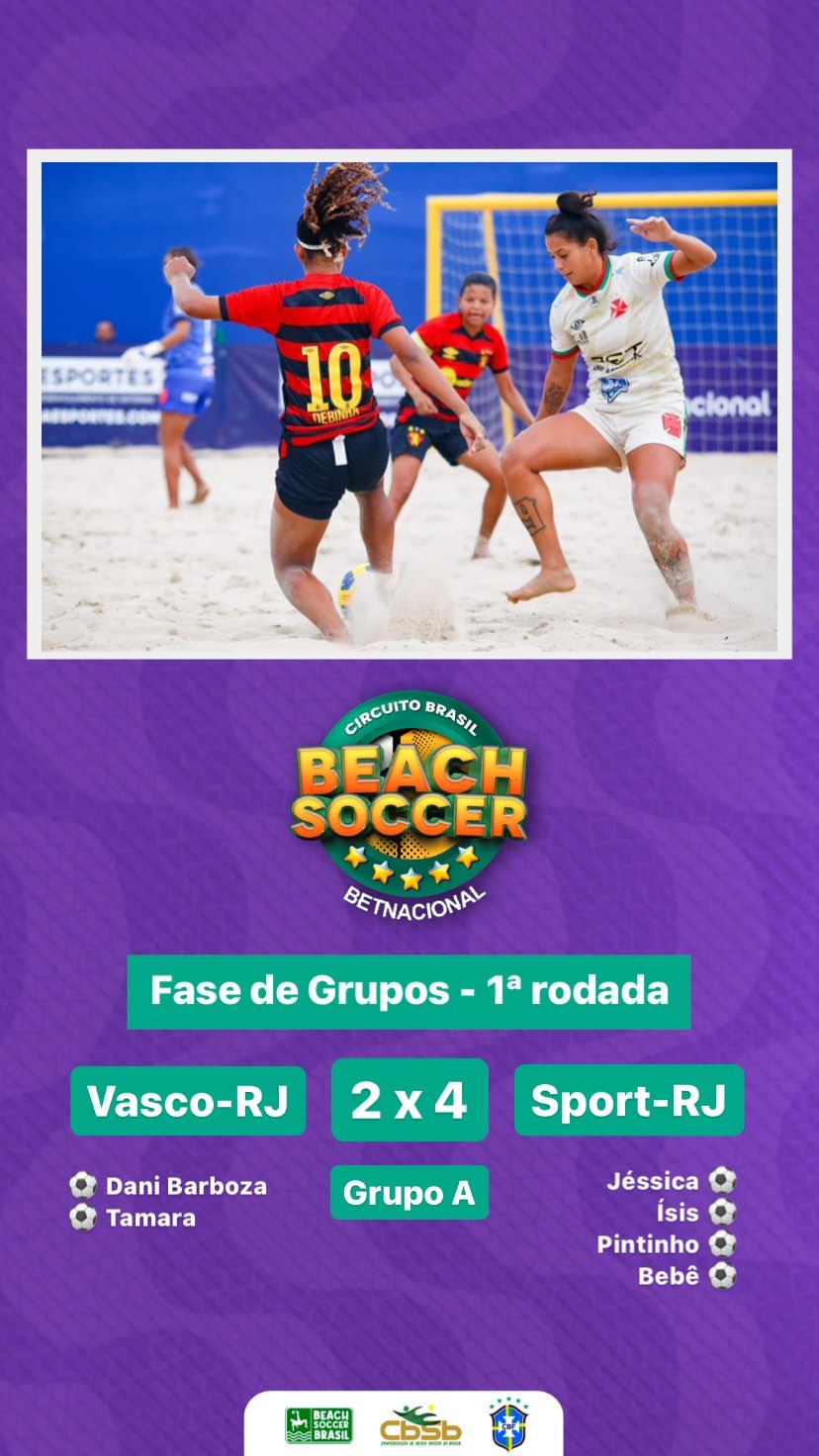 Em jogo realizado na manhã desta 3ª-feira na Praia de Copacabana, o Vasco foi derrotado por 4 a 2 pelo Sport em sua estreia no Circuito Brasil Feminino de Beach Soccer. O Vasco tentará a reabilitação na 4ª-feira, às 8h30, contra a União Desportiva Alagoana, no mesmo local.