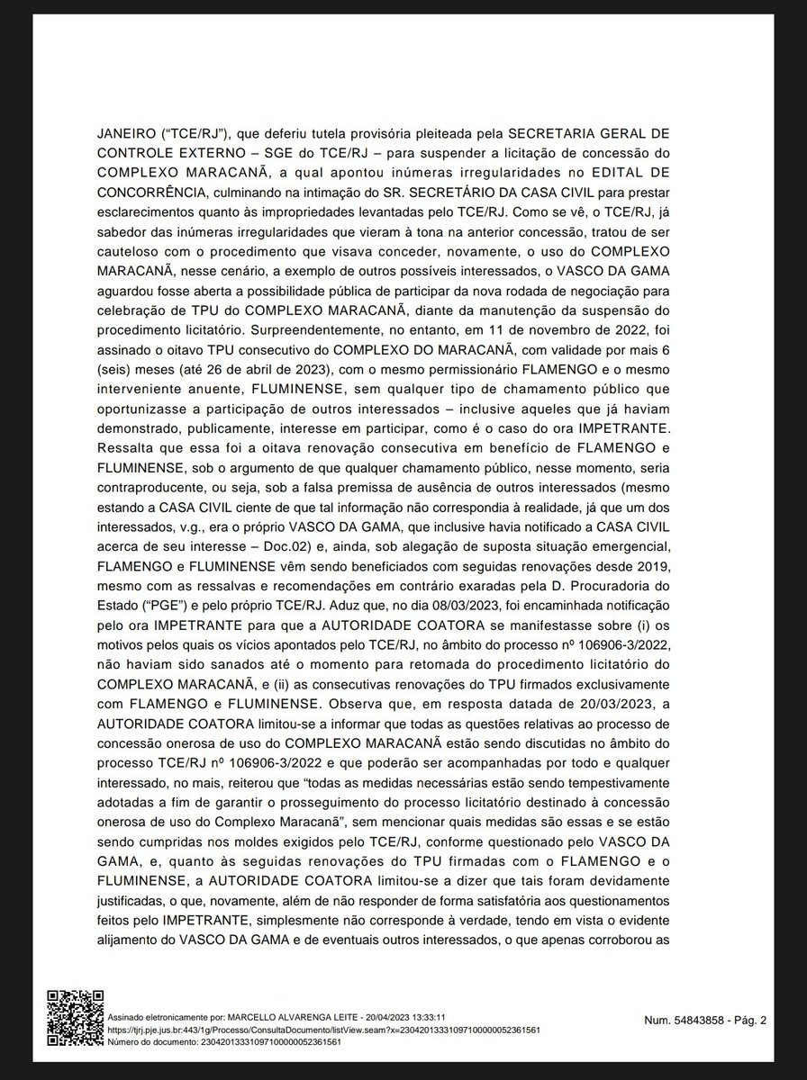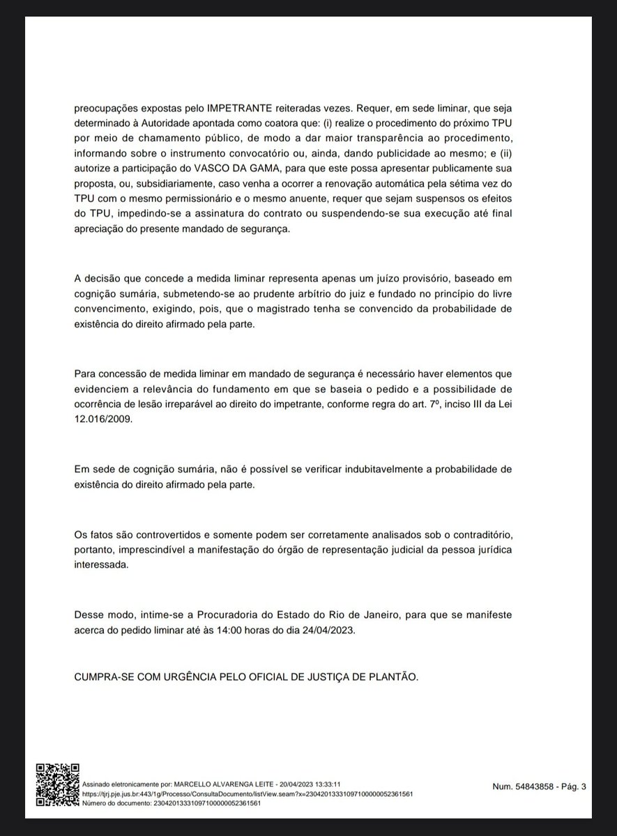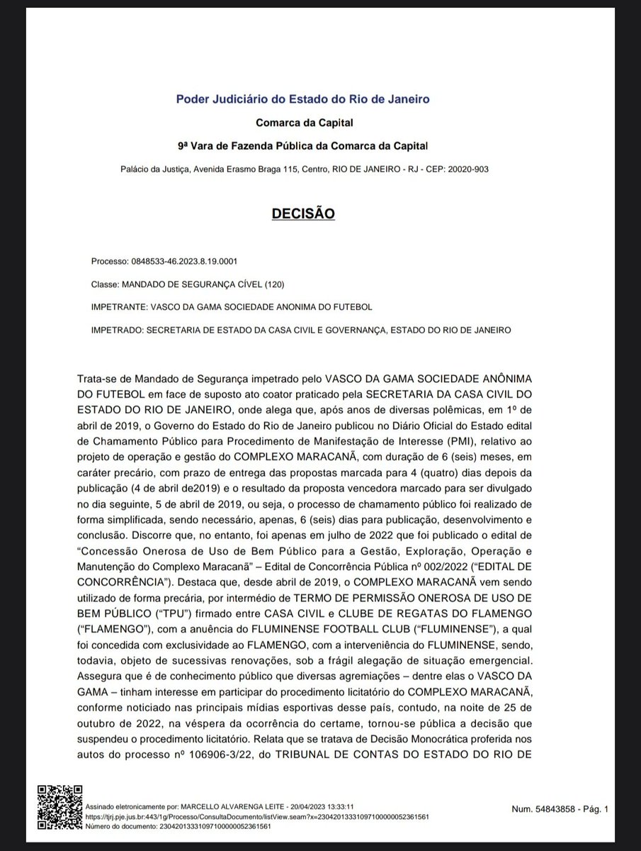 Decisão saiu após o Vasco pedir uma liminar para que impeça a renovação automática da cessão do TPU do Maracanã para a dupla FlaFlu.