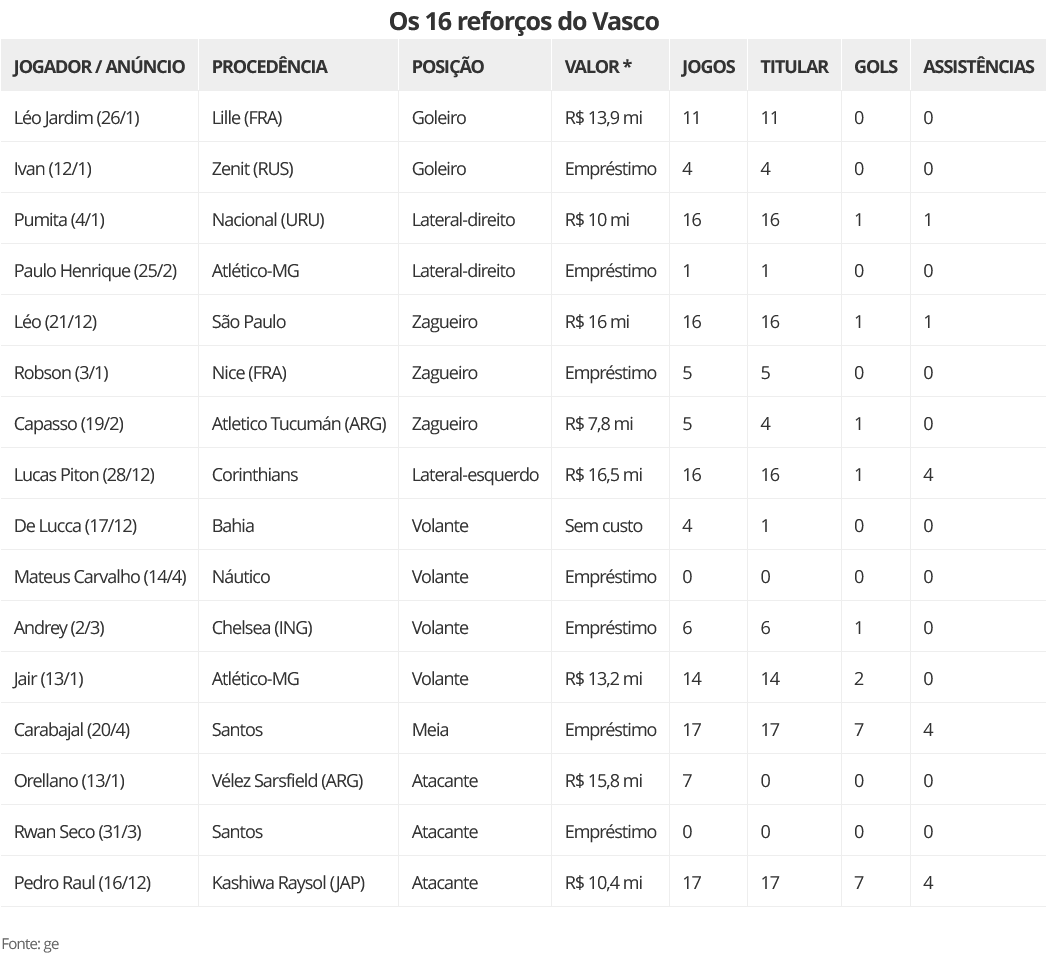 Com o fechamento nesta quinta, o ge faz um balanço das contratações. Quanto o Vasco investiu? Qual foi o principal modelo de negócio? Quem jogou mais? De onde vieram os reforços? Quais posições foram mais reforçadas? Essas e outras respostas você confere abaixo.