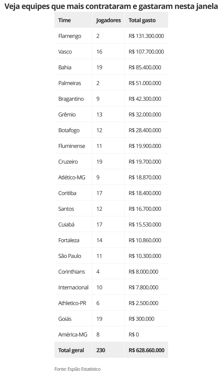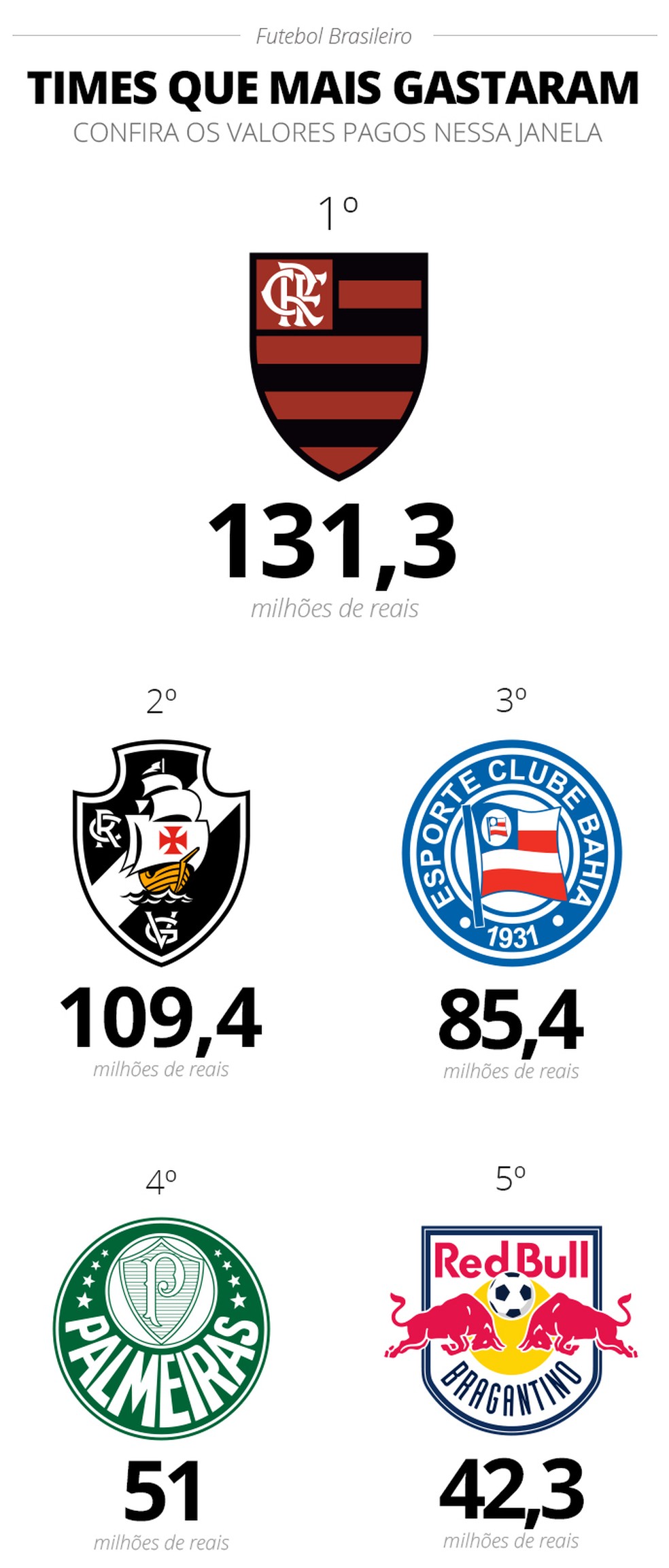 Com elencos recheados de craques, os multicampeões Flamengo e Palmeiras foram os que menos contrataram: só duas peças para cada equipe. Ainda assim, o suficiente para colocar a dupla entre os cinco times com maior investimento da janela. Confira abaixo: