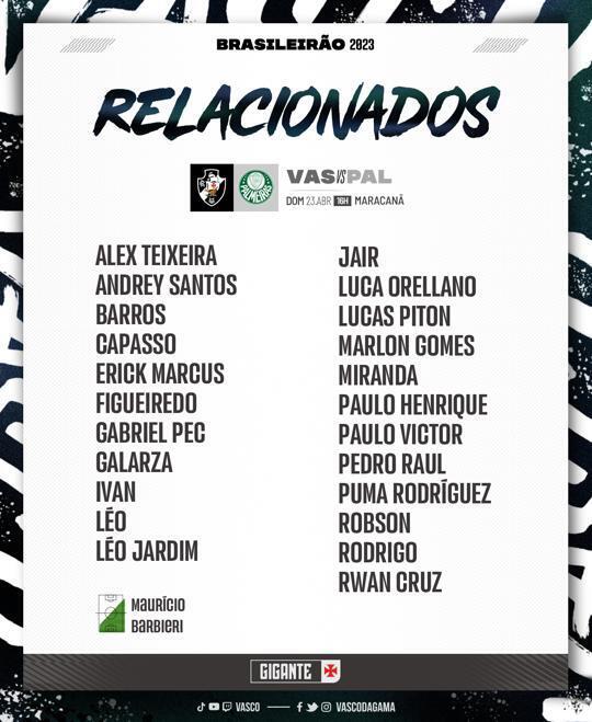 📋 Relacionados para o duelo entre Vasco e Palmeiras no Maracanã! 💢