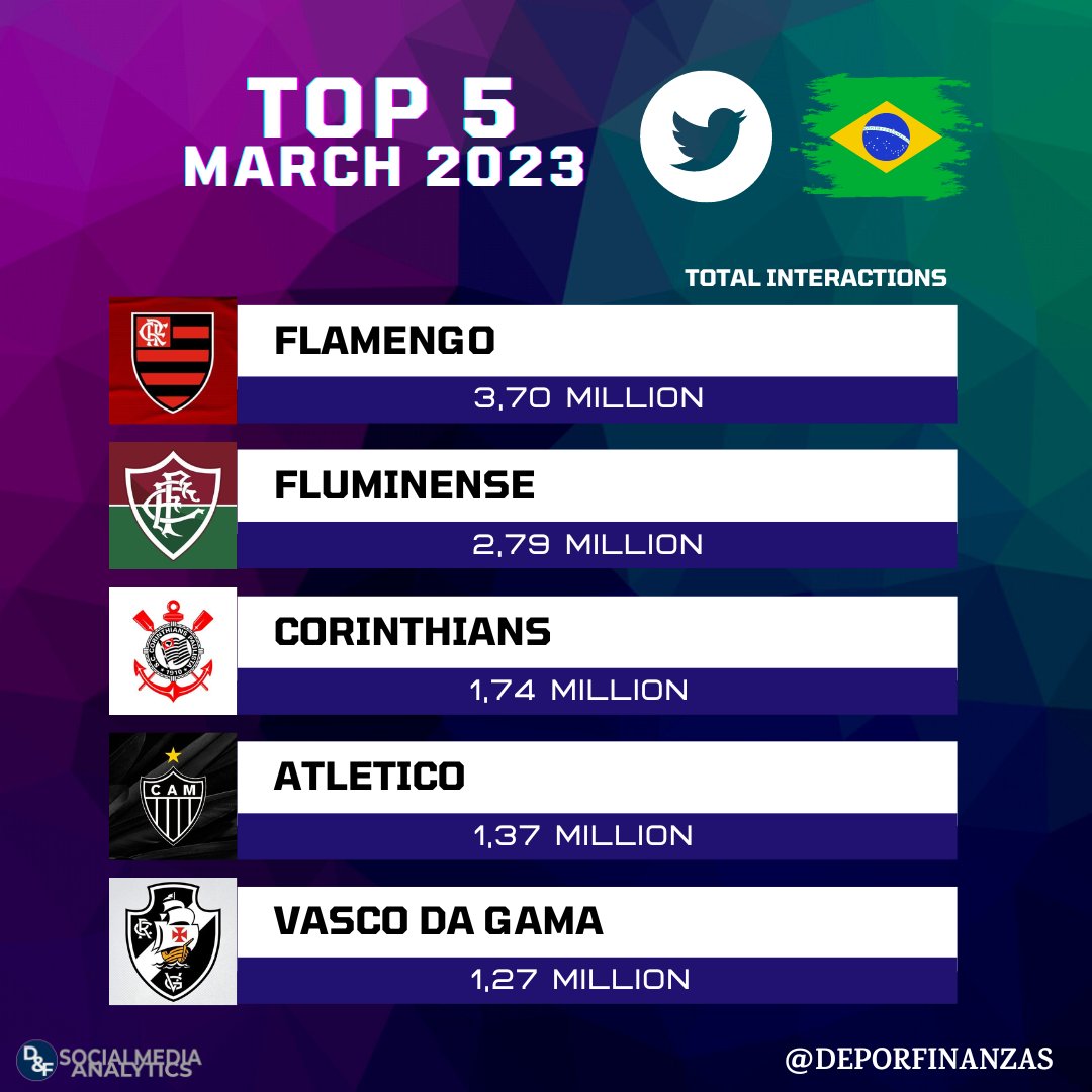 📲⚽🇧🇷 Os 5 clubes brasileiros com mais engajamento no #twitter durante março 2023!
