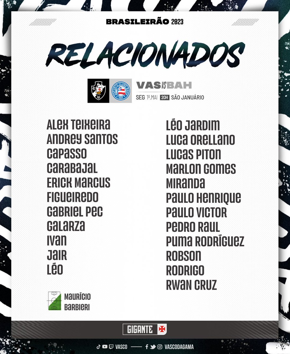 Vasco divulga os relacionados para o jogo contra o Bahia; Carabajal Ă© a novidade